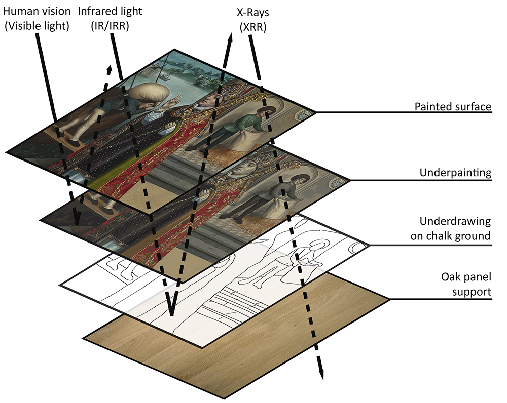 “An X-ray allows you to see through the entire painting, including the wooden panel support. Infrared images show the underdrawing best. I look from back to front: the drawing was made directly on the panel, then came the underpainting, followed by a first layer of paint to define light and shadow, and finally ten to twelve layers of oil paint.”